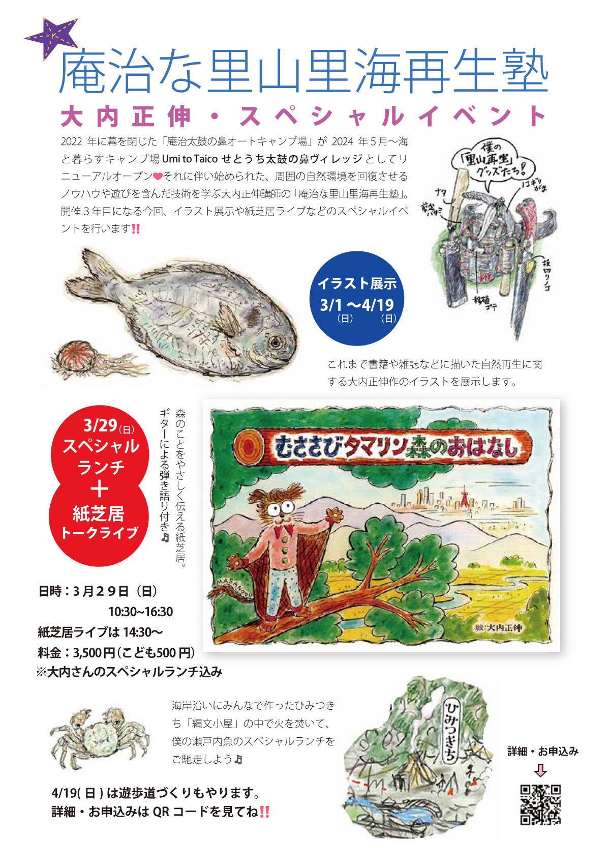 内容 : 大内さんによる作品紹介・紙芝居トークライブ・縄文小屋でのスペシャルランチなど